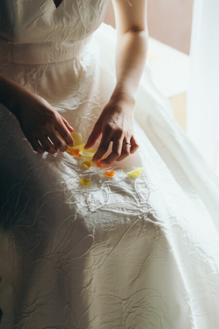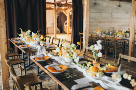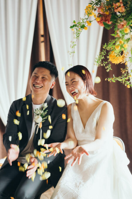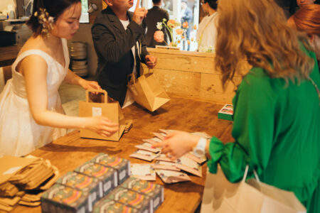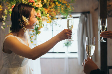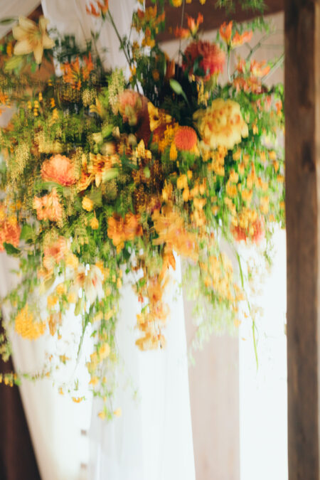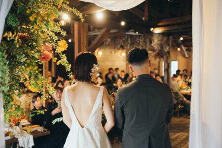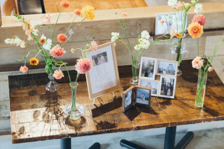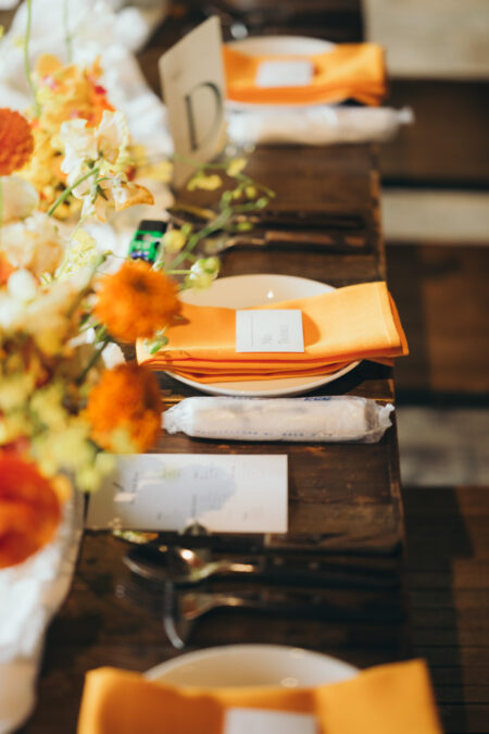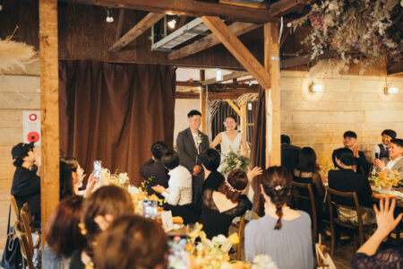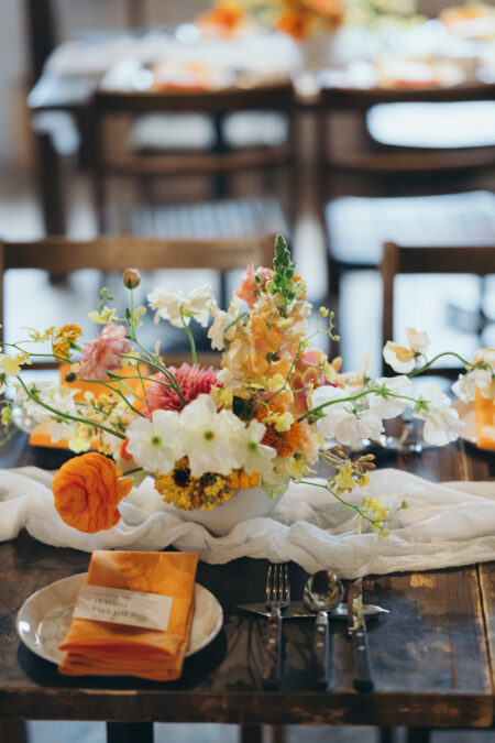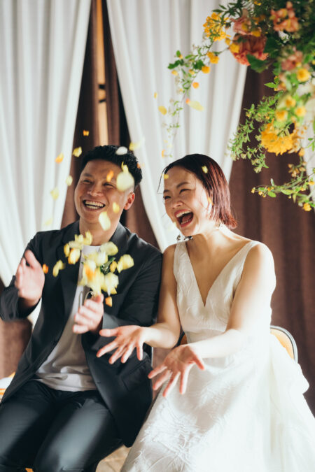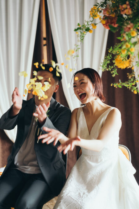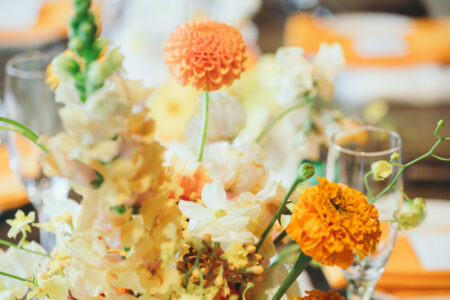 黄色やオレンジを基調にした元気いっぱいのカラーで彩られた空間は、ゲストと新郎新婦の笑い声とともに、あたたかな空間に。