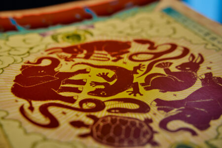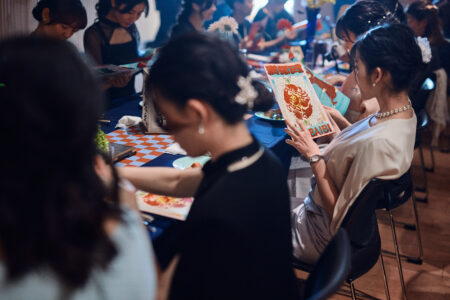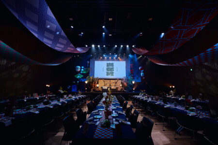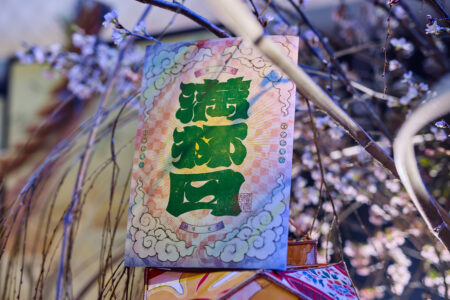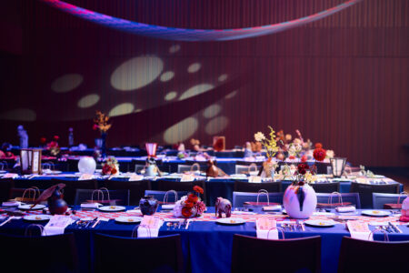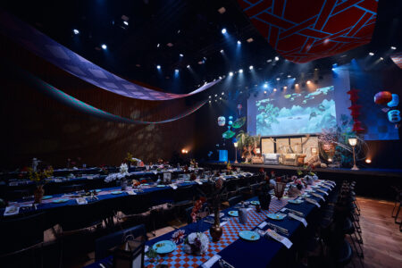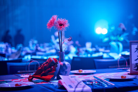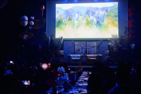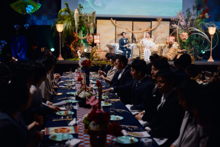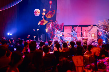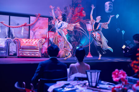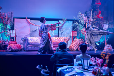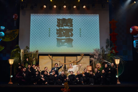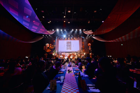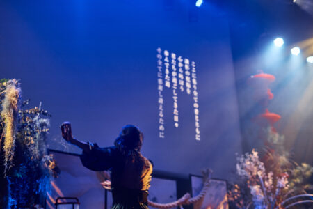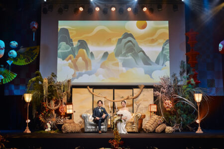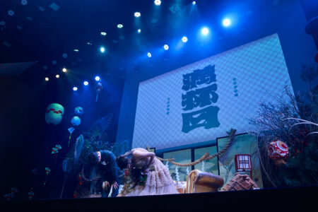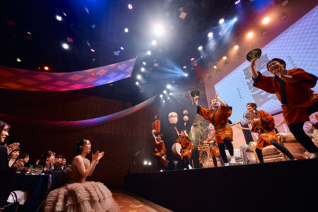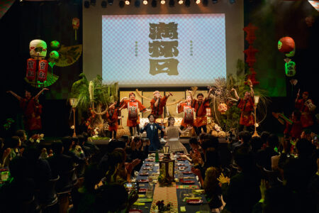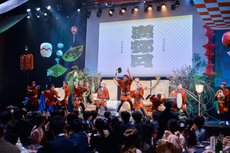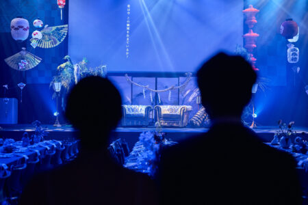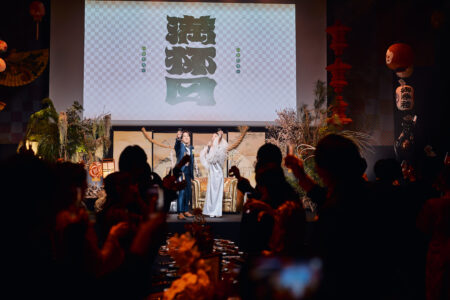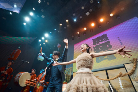 天高の神田明神ホールを活かして総量70mにもおよぶオリジナルタペストリーで世界観を演出。