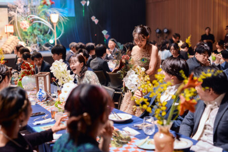 総勢180名のゲストが自然と輪に加わり、会場をぐるりと練り歩く祝福の舞に。