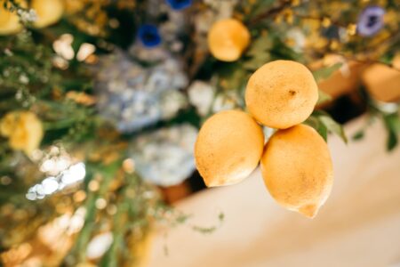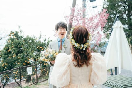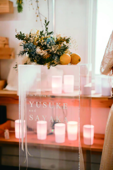 小田原の青い海、畑一面に広がる緑、そしてレモンの鮮やかな黄色をアクセントに、 新婦が営むレモン畑を会場に、もぎたてのレモンを使って、自然そのものを迎え入れた爽やかなウェディング。