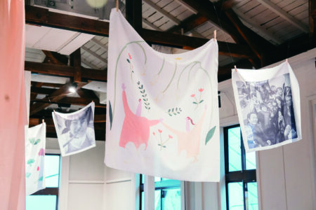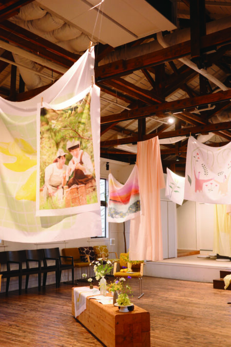 自然の風を感じながら、揺れるタペストリーに、心地よさと人の温かさが重なる空間を表現しました。