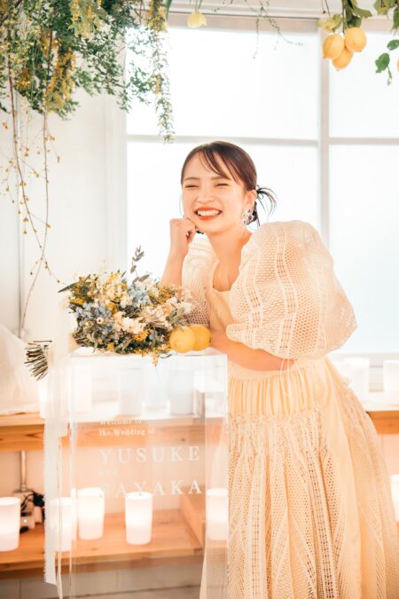 新婦のドレスも、レモン畑に立つ姿をイメージして、オーダーメイドドレスを【CANSHO】にて制作しました。