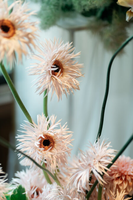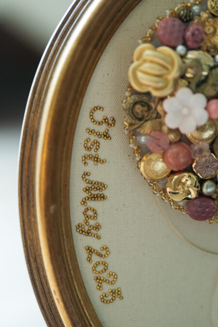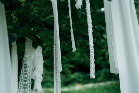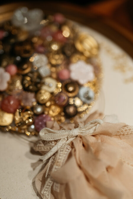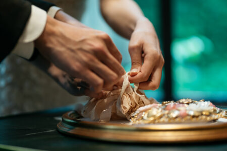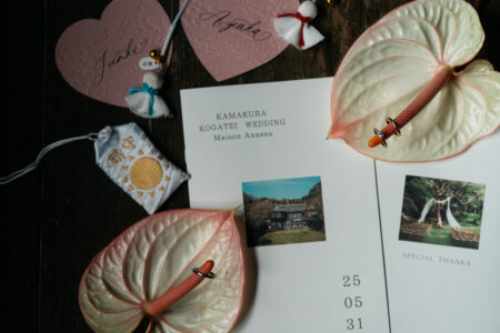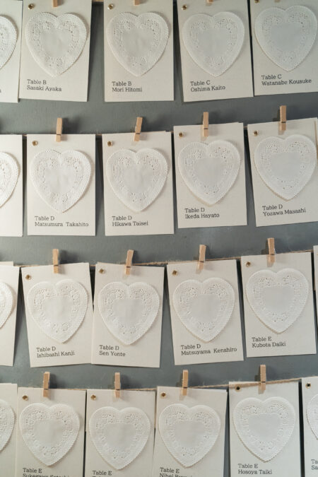 結婚宣誓のオブジェは、「輪を結ぶ」という言葉に重ね、ゲスト一人ひとりに結んでもらう参加型のスタイルをオーダー。