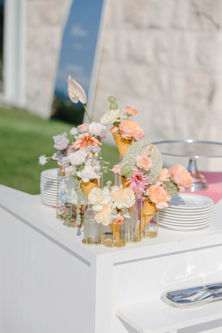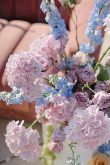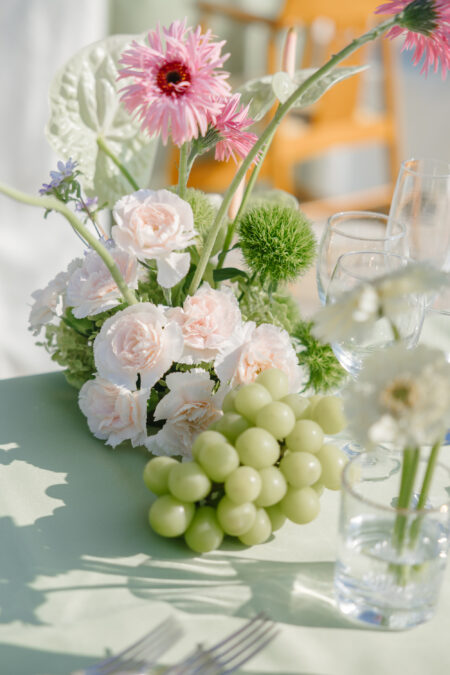 お花は華やかでカラフル、ボリュームのある花をたっぷり取り入れた空間にしました。