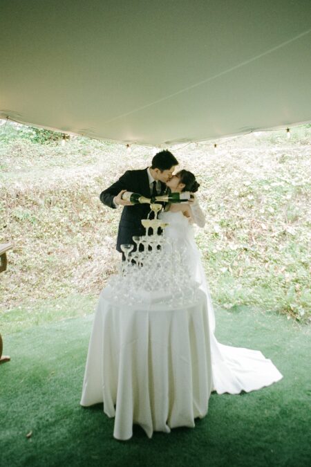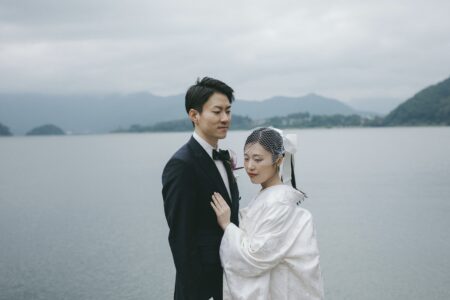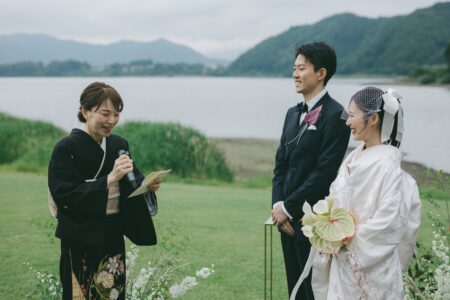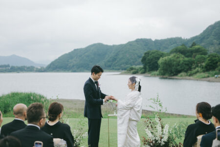 一部は湖畔での親族祝言式と着席披露宴。 二部はガーデンテントでのセレモニーと、立食のブッフェパーティー。