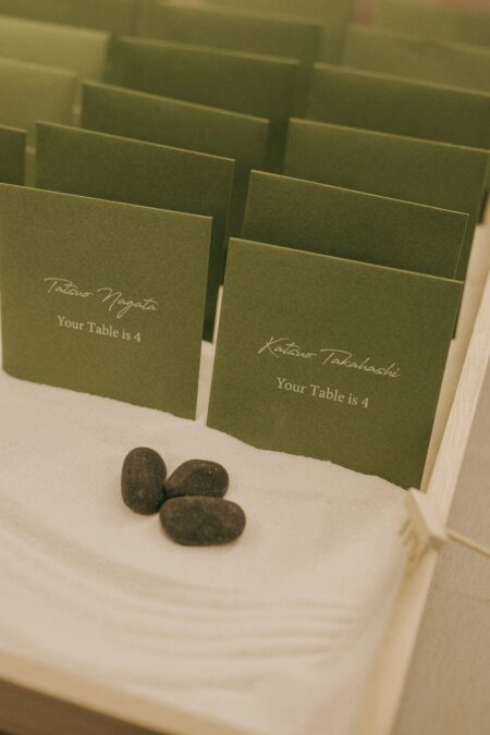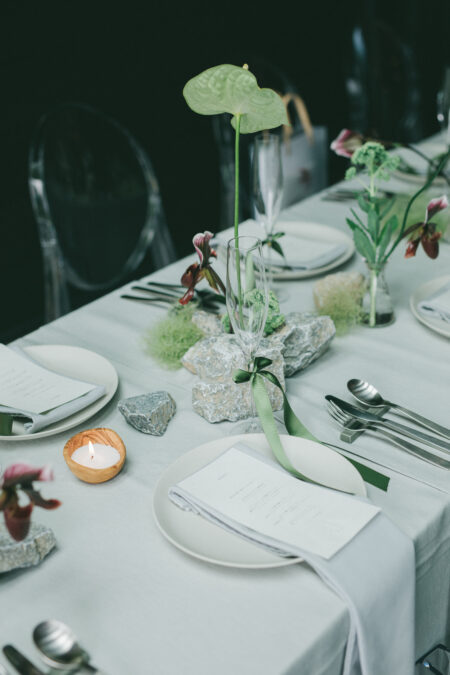 石を使ったテーブル装飾や、砂状のキャンドルを木の器に入れて使用したり、素材の質感が感じられるアイテムでコーディネート。