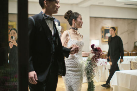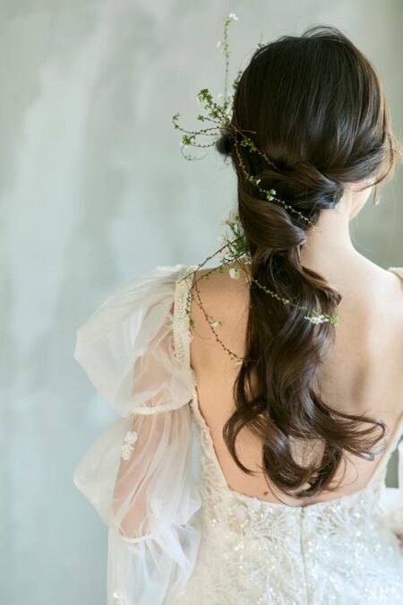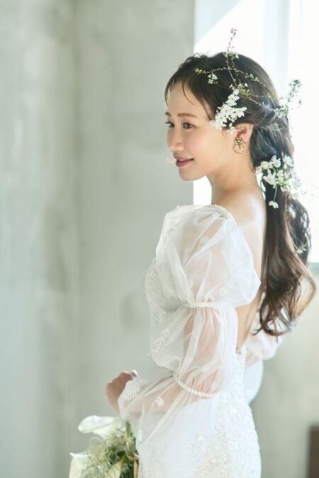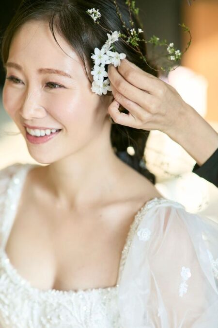 ヘアにも生花をあしらい、入場曲は『ラプンツェル』。