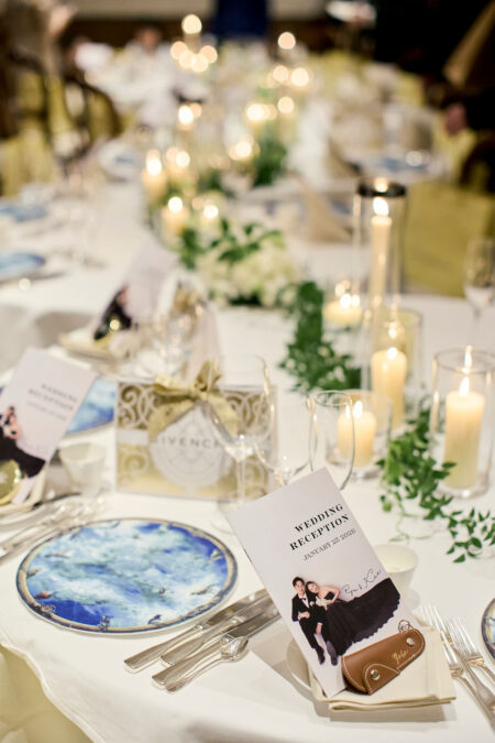 海外ウェディングに着想を得て円卓を配置し、白を基調に緑を添えたお花とたくさんのキャンドルで空間を演出しました。