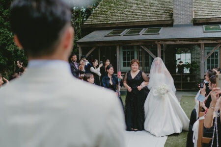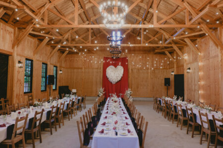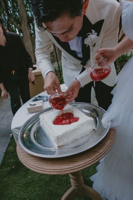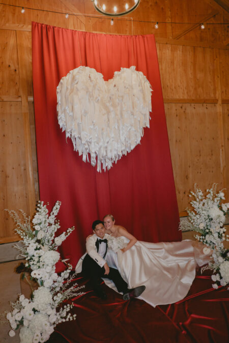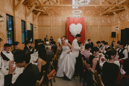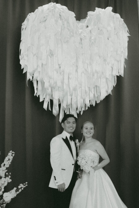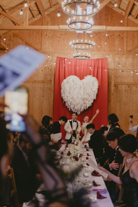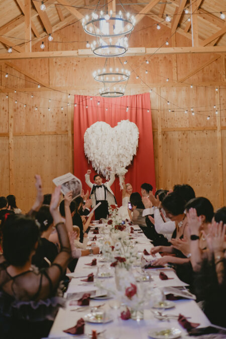 高砂にはシルクリボンでつくった大きなハートのオブジェを飾り、7m超の天井から巡るイルミネーションがアメリカンムードを演出。