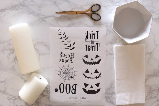 デザインを切り取ったらキャンドルにのせて水にぬらした布でポンポンするだけなので、子供でも楽しく手作りできるのがいいところ。子供たちが集まるハロウィンパーティーのアクティビティとしてもおすすめです。