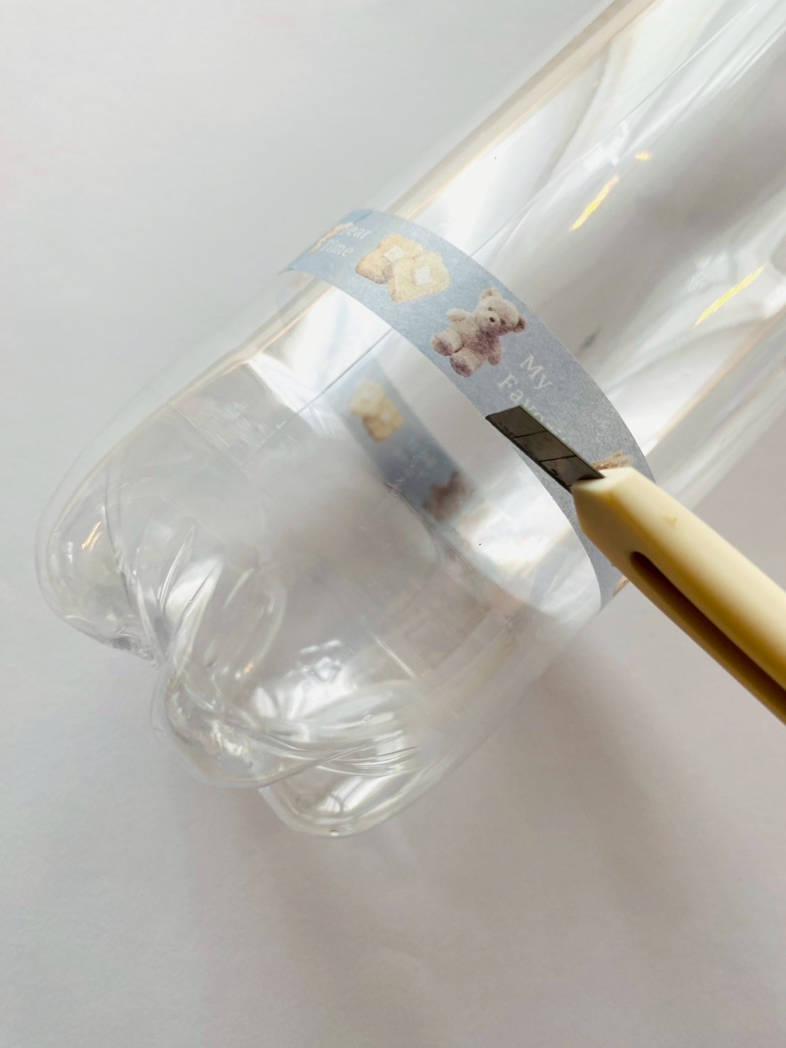ペットボトル下から1/3ほどのところに、マスキングテープを貼り、ガイドラインをつくります。