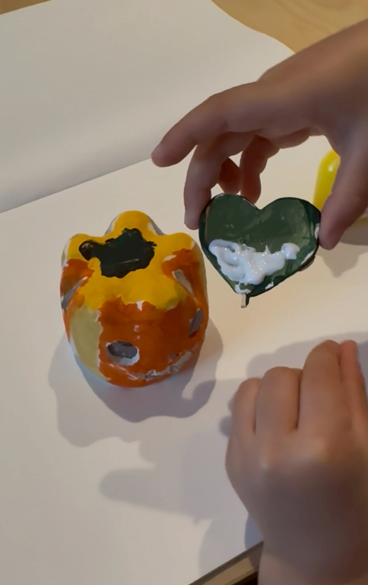 粘土をこねて、広げて、形をつくってから、色を塗っていくという、簡単な工作ですが、子どもの指先や想像力を育てる知育要素がたっぷり詰まってます。