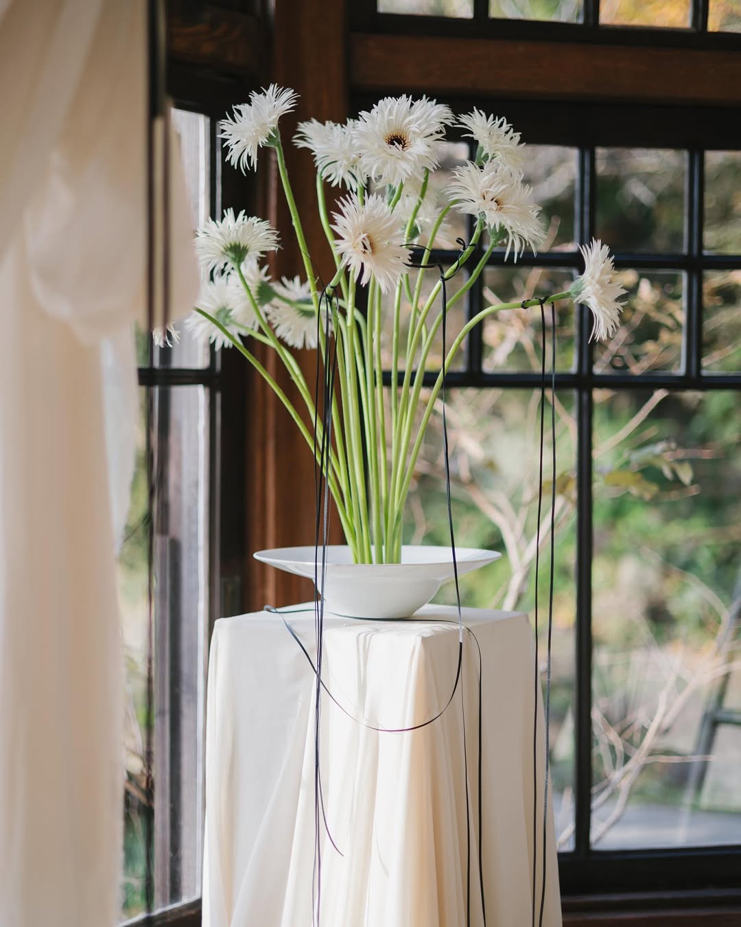 さらに、反対側に置かれた白い装花が布と対称になり、洗練されたバランスが完成。