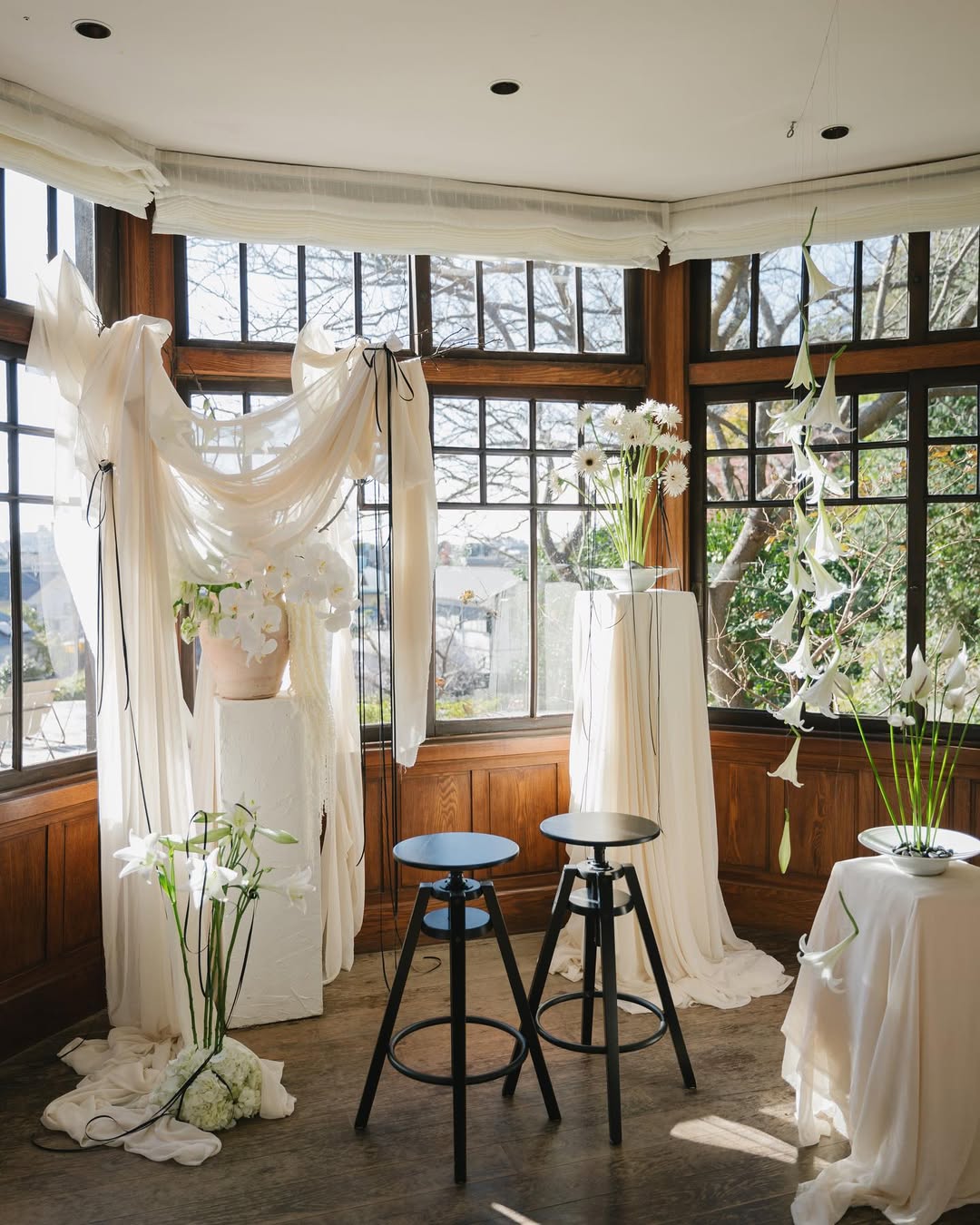 自然光が差し込むガラス張りの会場に、あえて大きな布をかけて背景をつくったコーディネート。