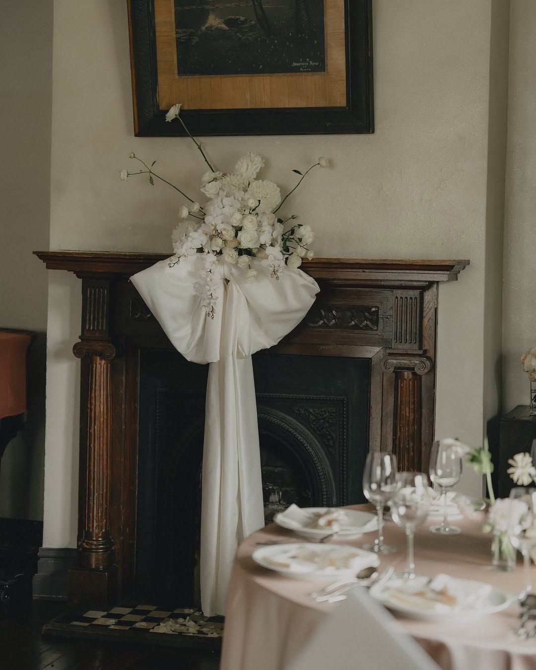 暖炉に添えたリボン装飾が洋館の趣としっとり調和 (出典元 Instagram:@kenobi_wedding)