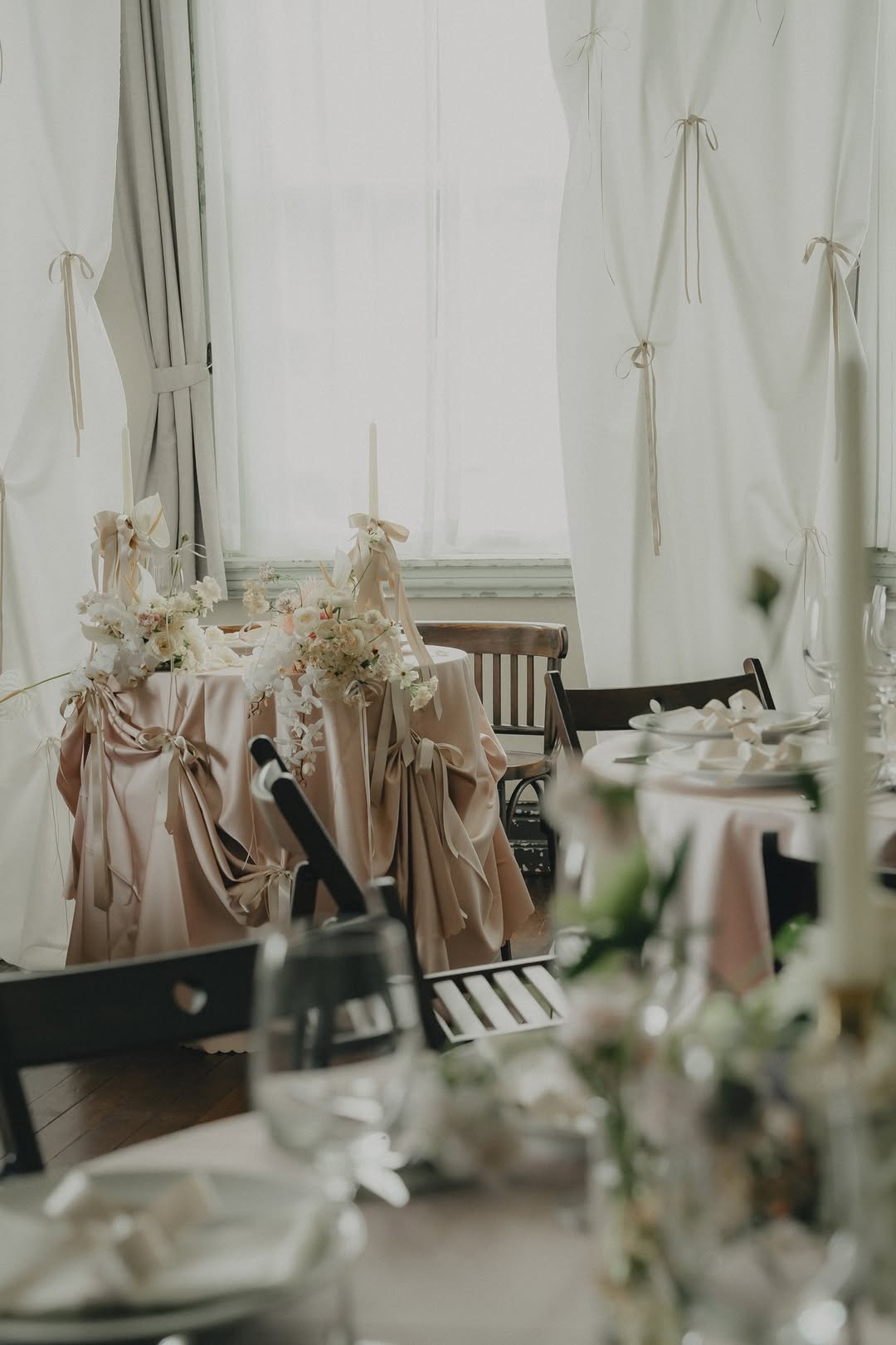 クロスとリボンの質感を合わせて、空間にやさしい一体感を (出典元 Instagram:@kenobi_wedding)