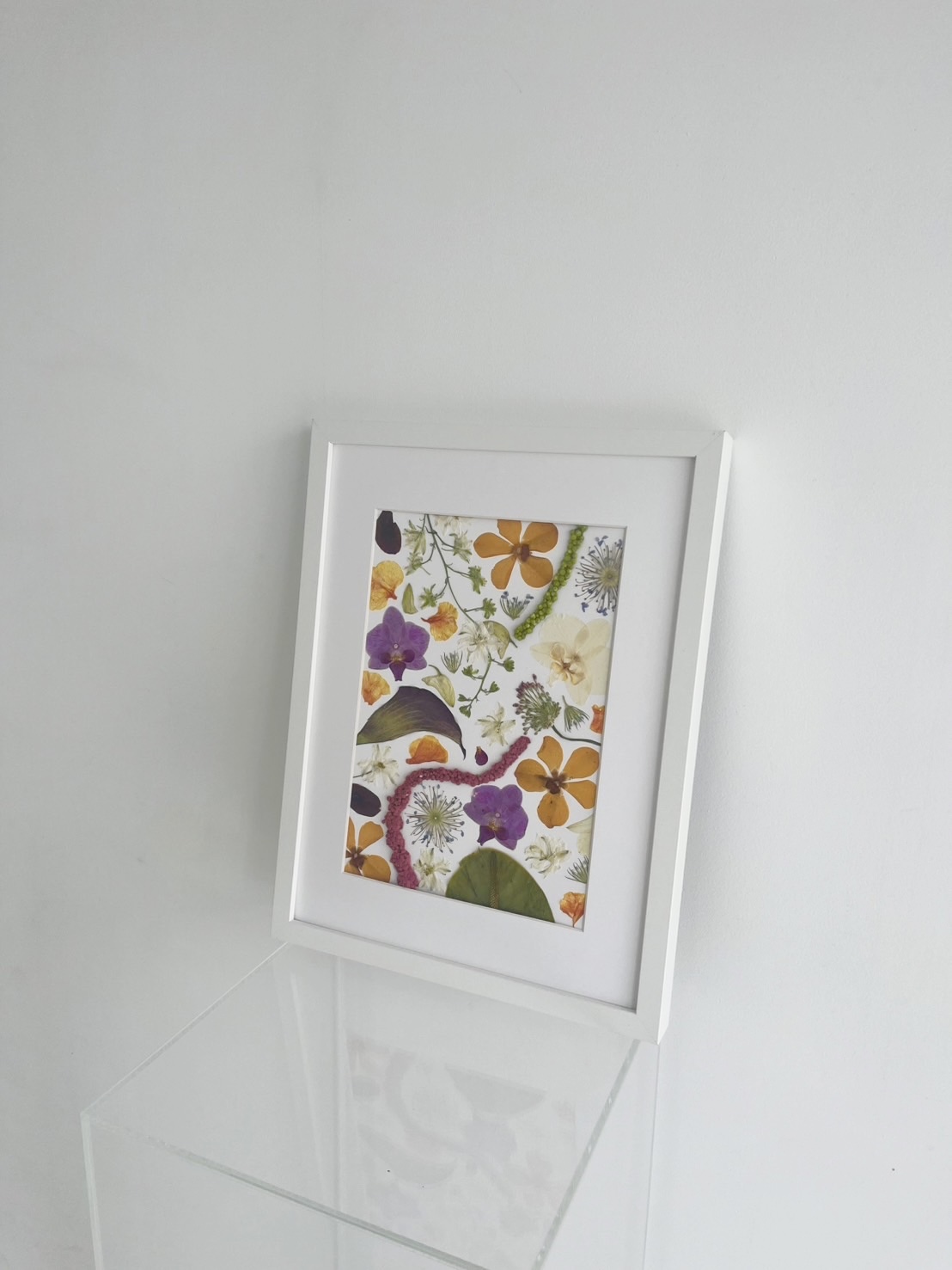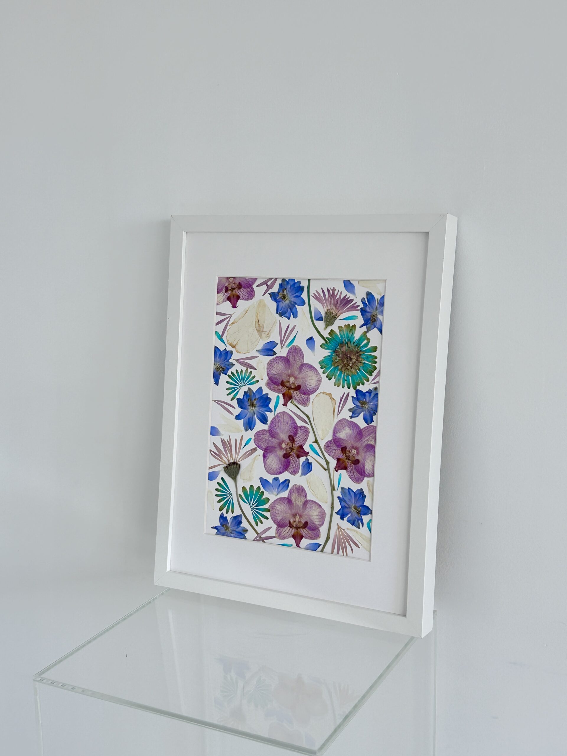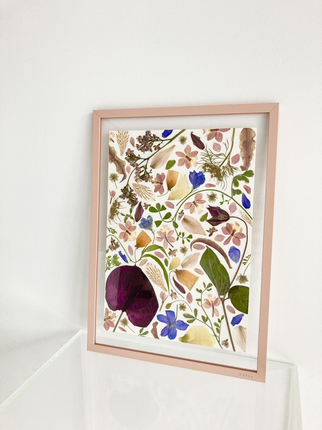 メインのお花を丁寧にプレスして、台紙いっぱいに小さなお花と動きのある葉をレイアウト。