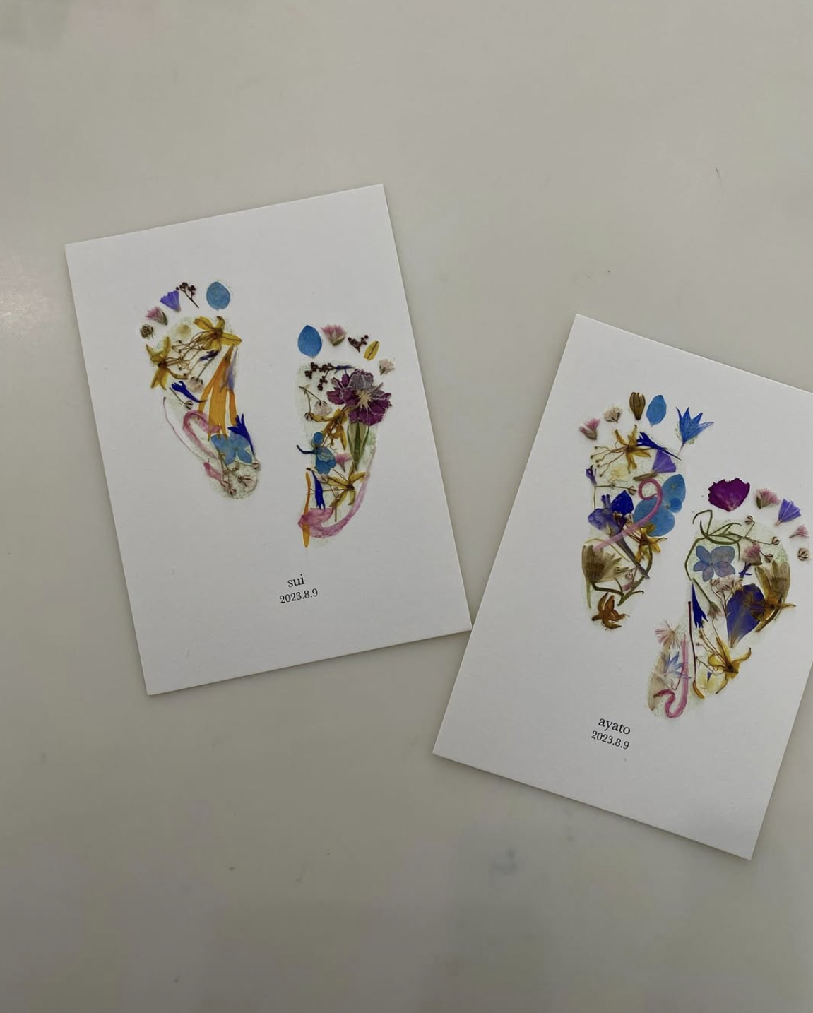 新生児の足型に、押し花を貼り付けた足型アートも人気。