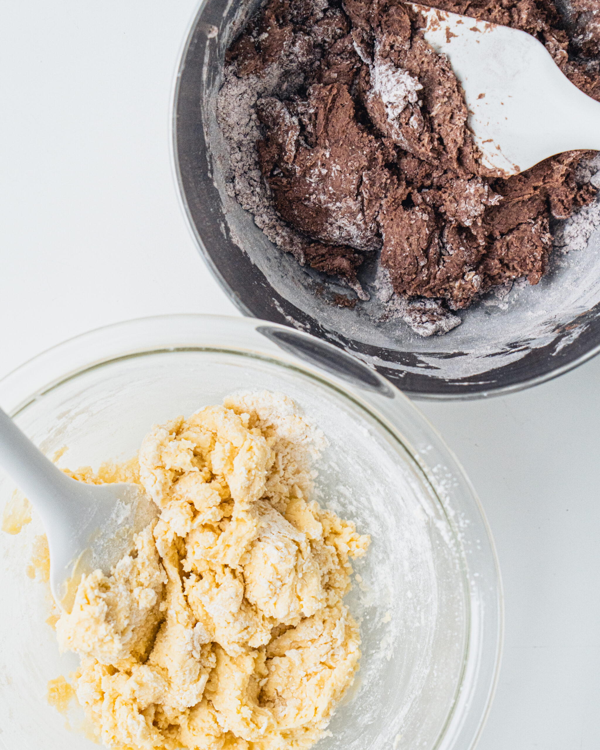 生地を2等分し、それぞれに薄力粉・ココアを加えて混ぜる。