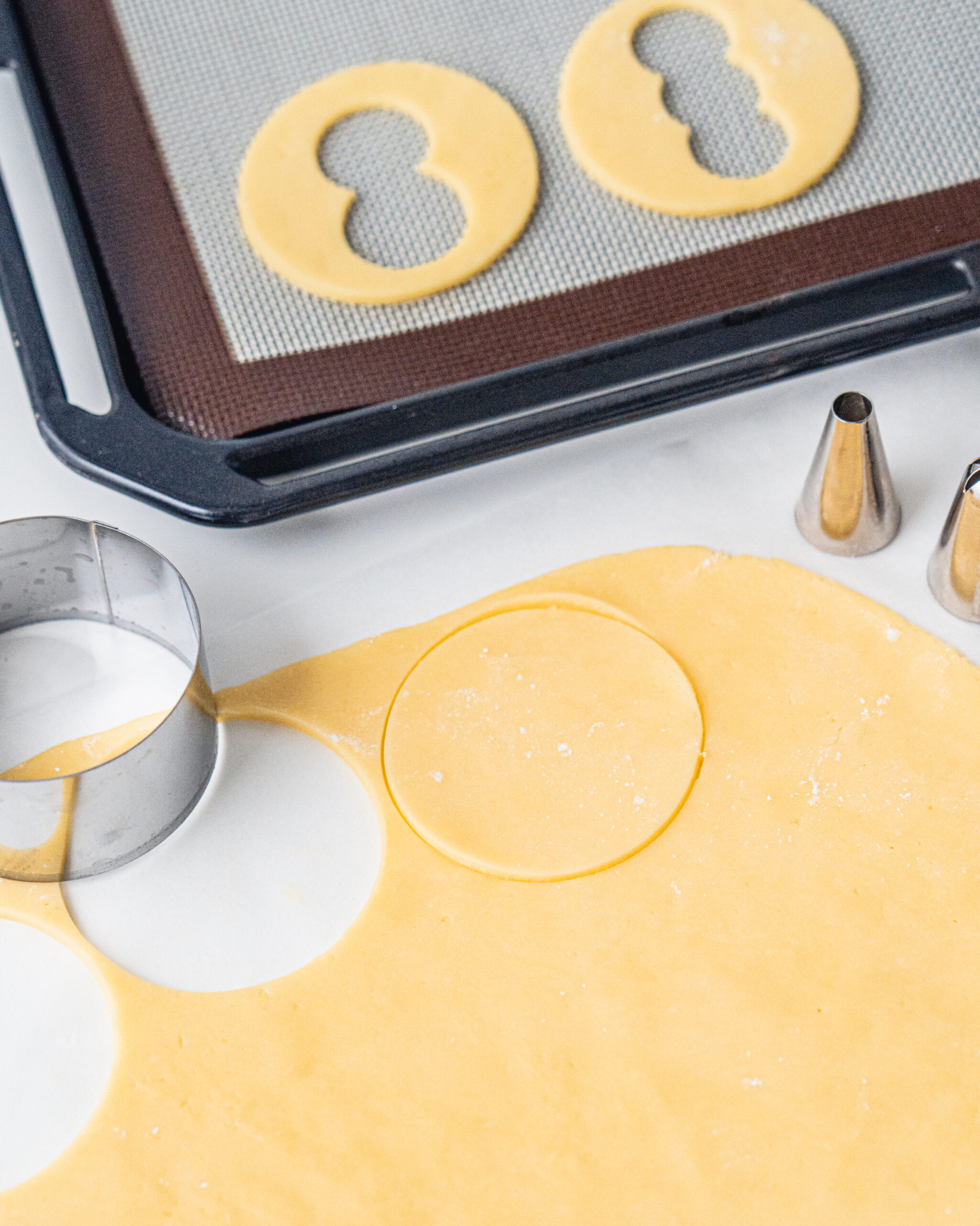 生地を伸ばし、8cmのセルクルで円形に型抜きする。