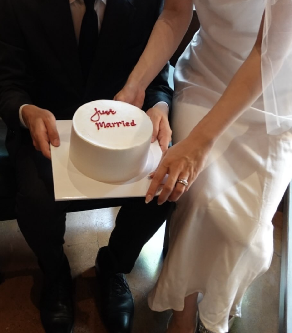 マリッジケーキを使った海外風の入籍フォトアイディア。