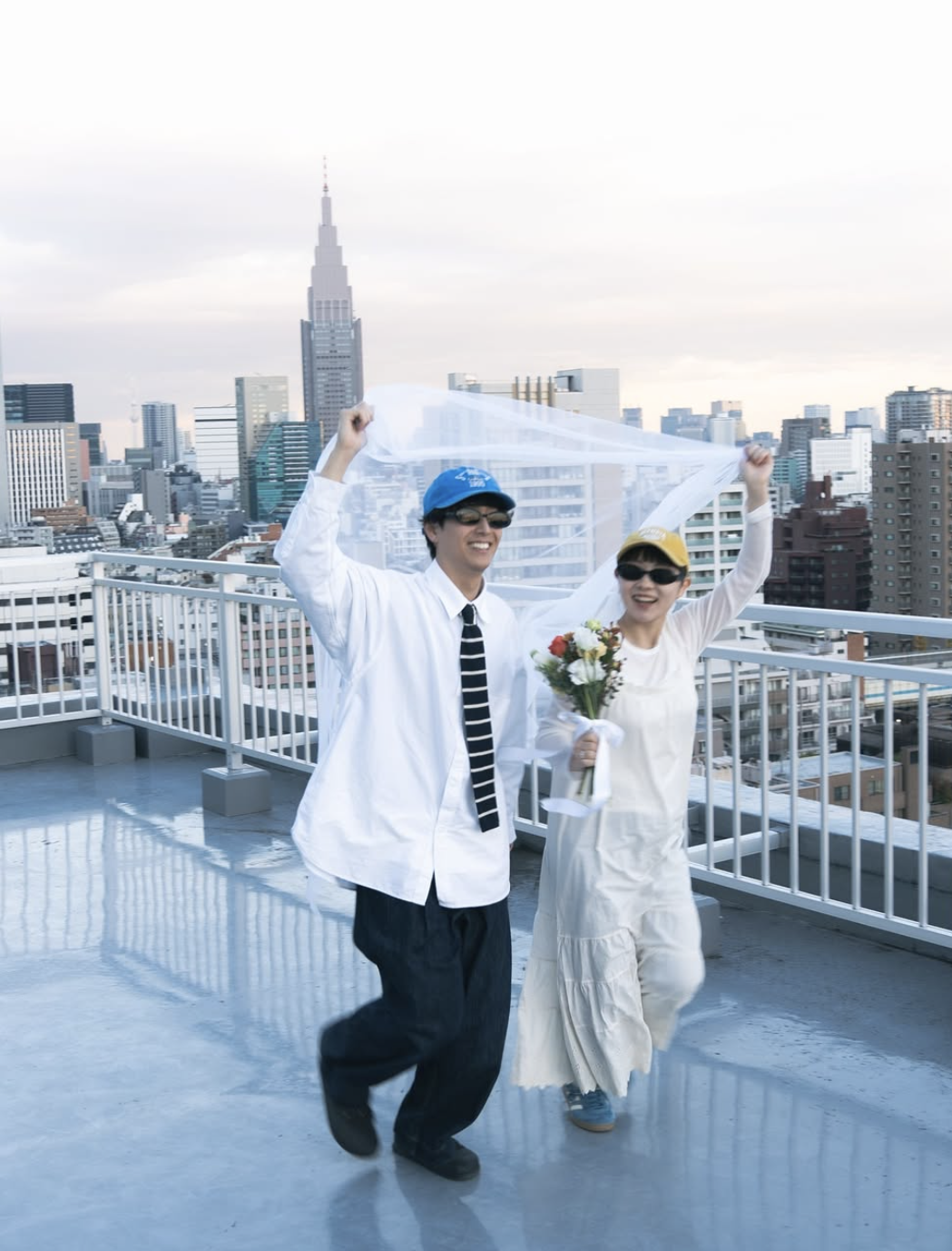 キャップやスニーカーなどのカジュアルなアイテムに、ベールやブーケで“ちょっとしたウェディング感”をプラスするのがポイントです。